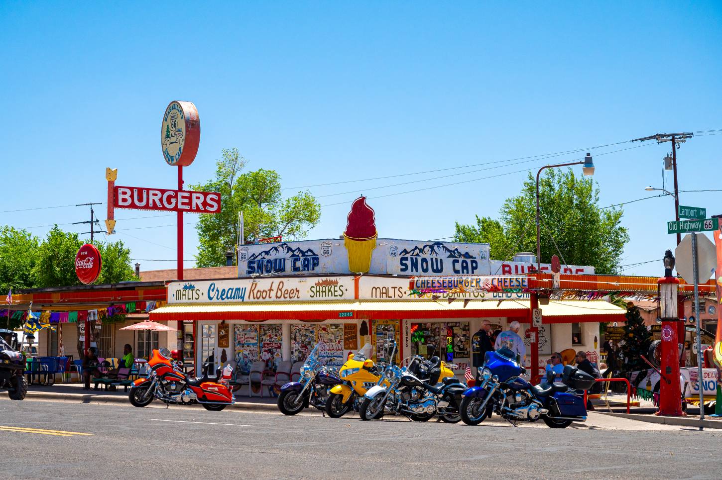 Seligman nennt sich die „Wiege der historischen Route  66“ und kein Ort verkörpert das besser als Delgadillo’s Snow Cap. 1953 eröffnete Juan Delgadillo das Drive-in aus Schrottholz der nahegelegenen Eisenbahn – ein Bau voller Skurrilität, Kreativität und Humor. Von den legendären Schildern wie „Cheeseburger with Cheese“ bis zu der augenzwinkernden „Sorry, We’re Open“-Tafel: